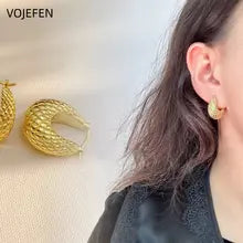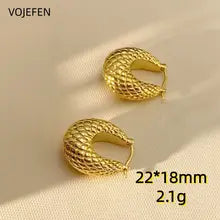 VOJEFEN, Original 18 K Pure Gold, Earrings Hoops, Wave Pattern Round, Golden Vintage, Women Fine Jewelry,